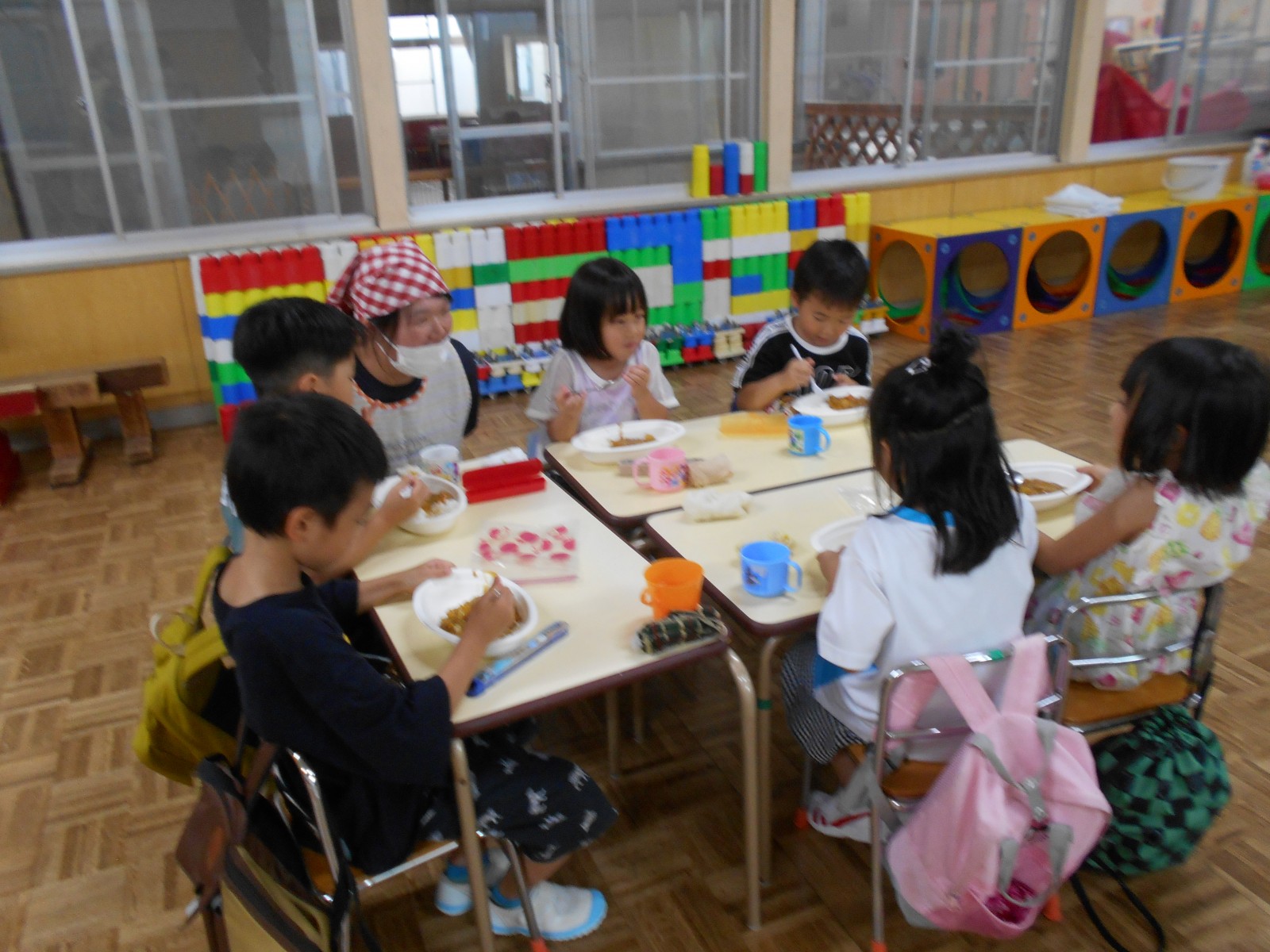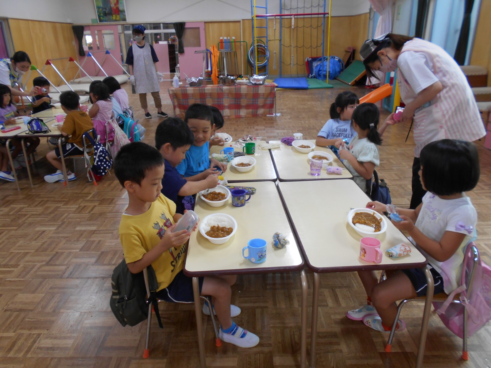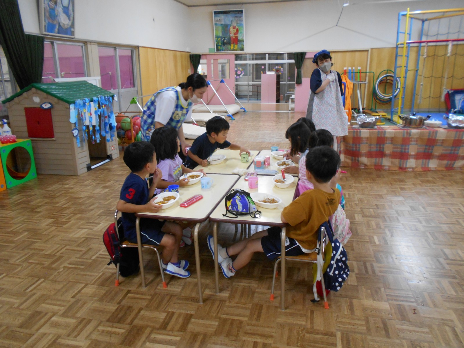 その後、ホールで汗をかいて動き回って遊び、いよいよみんなが切った野菜などが入ったカレーの食事会です。
