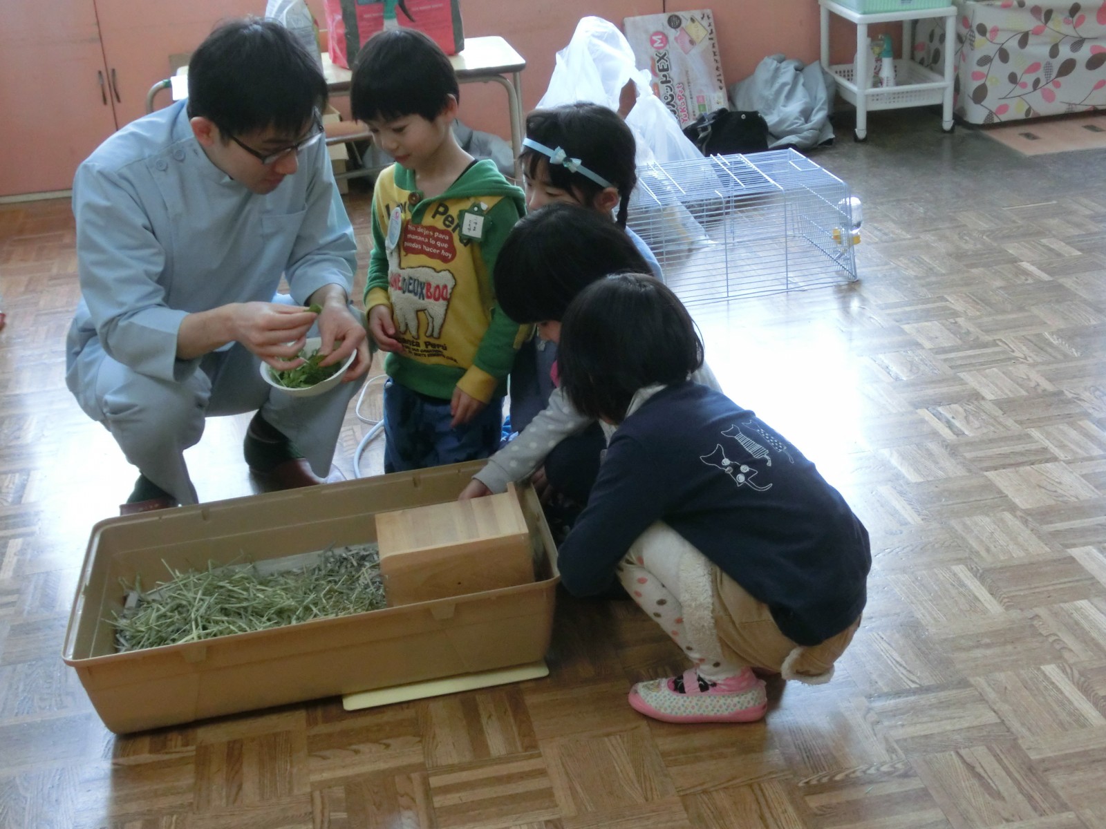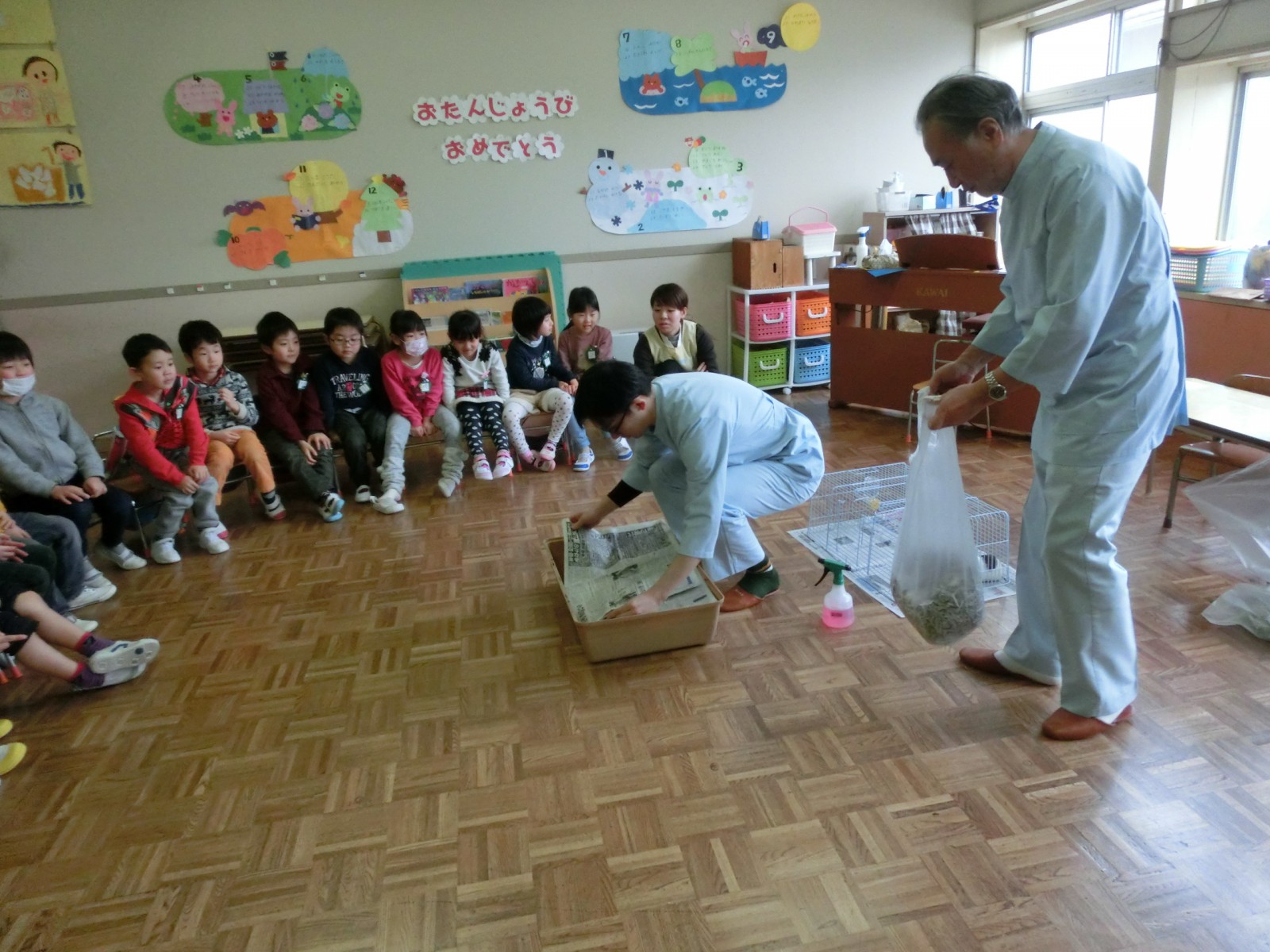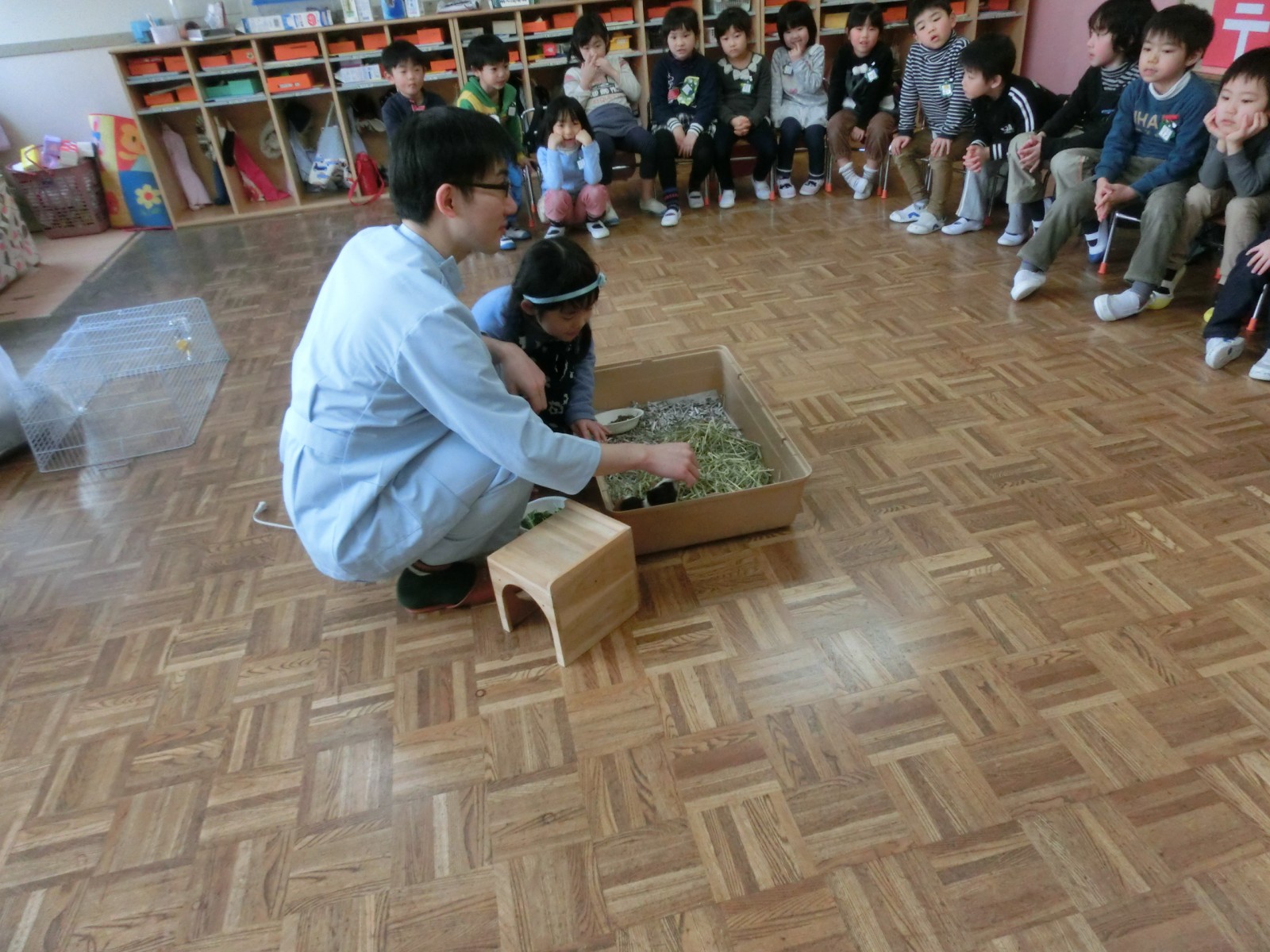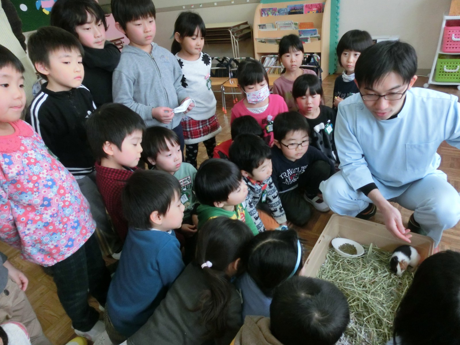 2月8日に園の獣医さんである宮川先生からモルモット君をいただきました。12月5日に生まれたモルモット君は宮川先生のところで人間に慣れるためにたくさんかわいがっていただいてから、やってきました。今日は宮川先生親子から「飼い方の大事な点」をうめ組さんが伝授し、「お世話の仕方」もしっかりお聞きしました。明日、いろんな名前を考えていた中から、みんなで名前を付けて大事に大事に!お世話していこうと思います。宮川先生ありがとうございました。これからもどうぞよろしくお願いします。