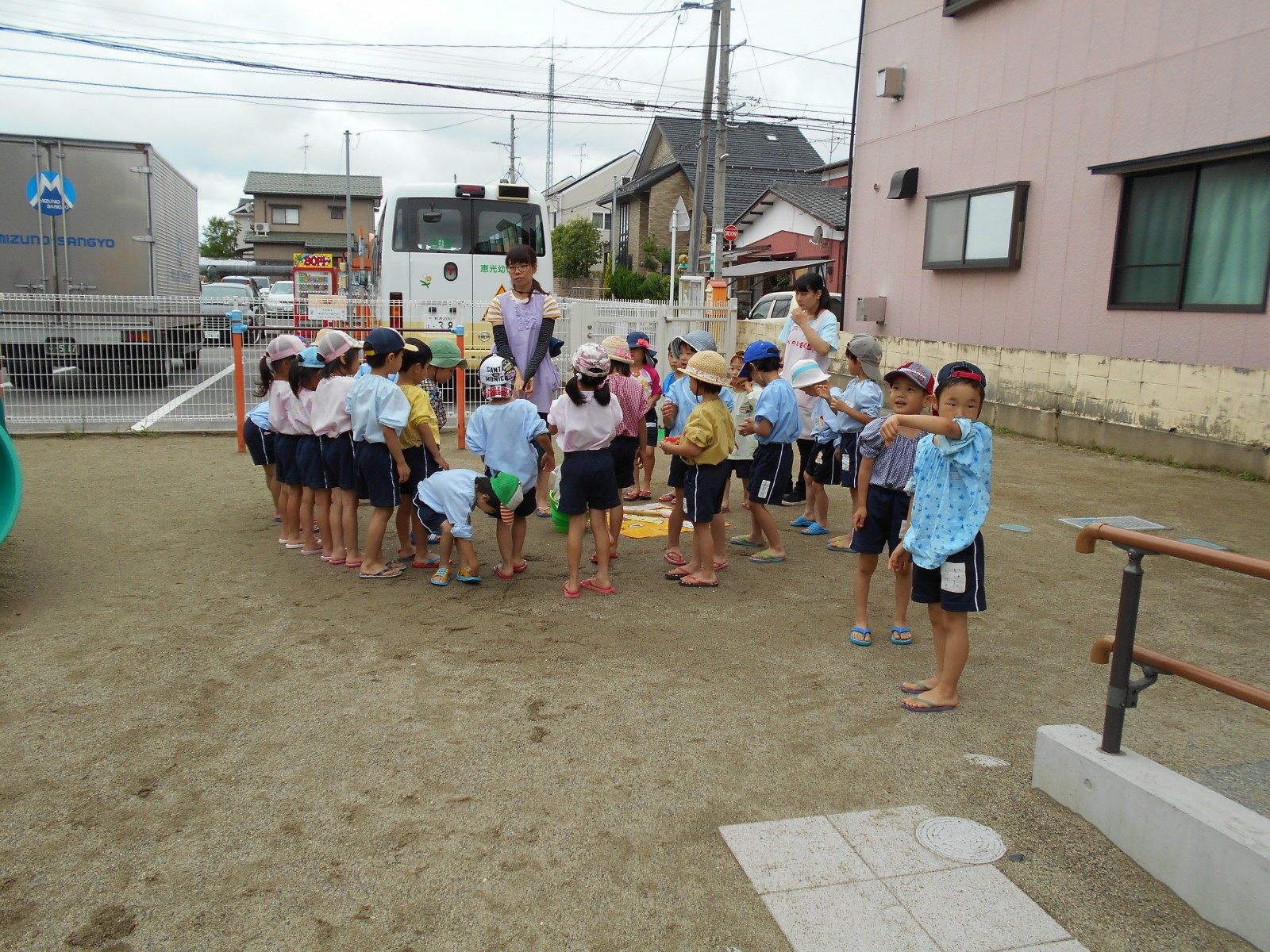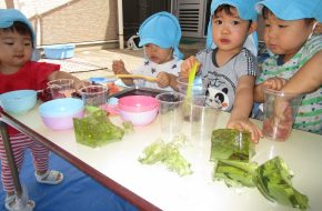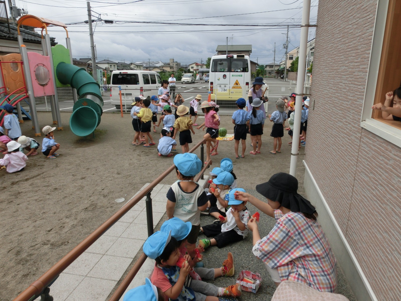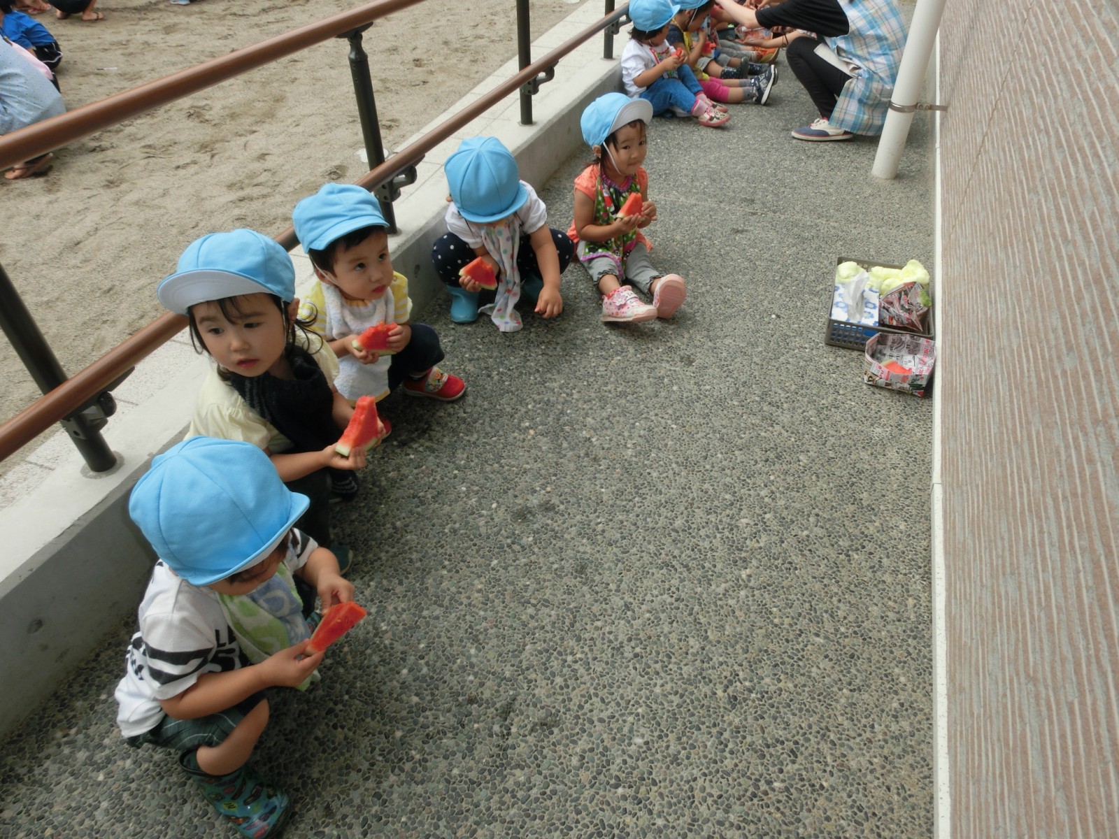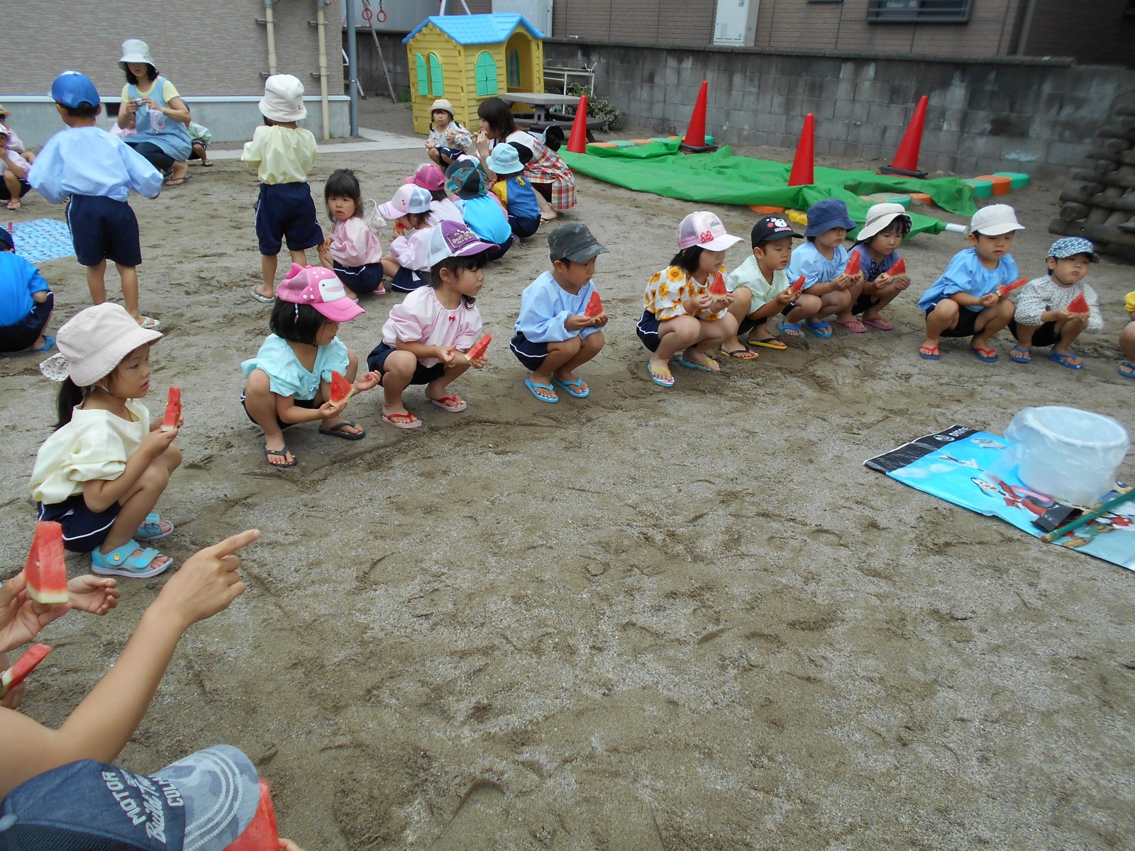 いちご組さんもベランダからお姉さんたちのすいか割りを見た後、一足お先においしいスイカをいただきました。この日はひこばえさんもあやかっていっぱい食べることができました。種飛ばしもしたので、園庭にスイカの芽がはえてくるかも!