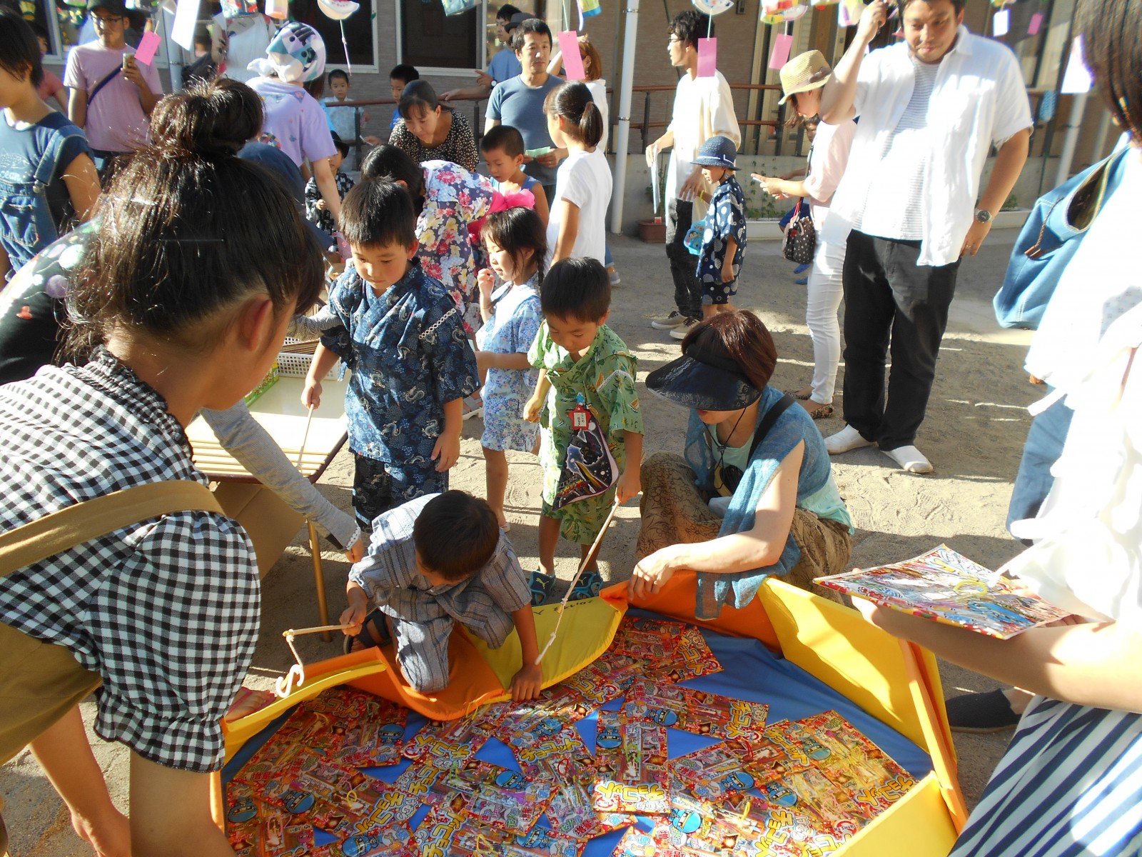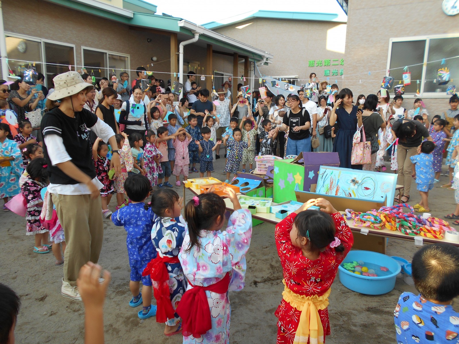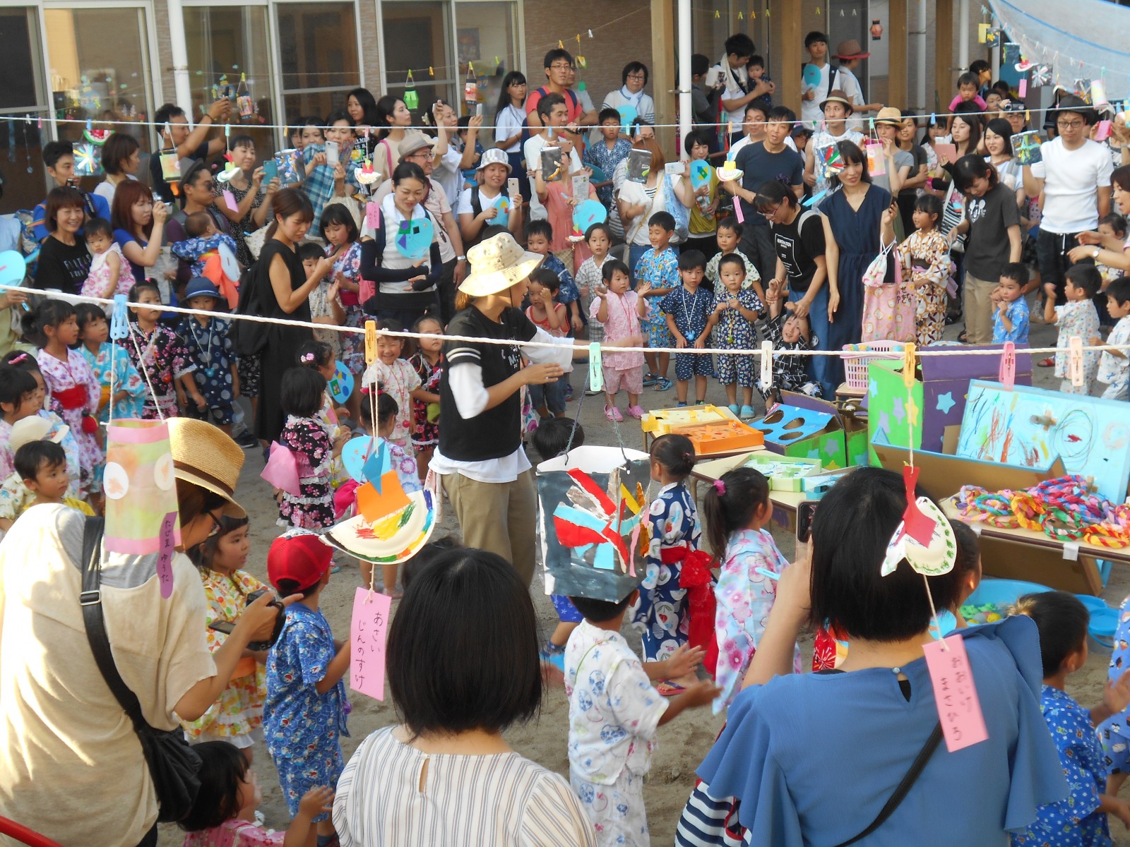 暑い土曜の夜のお祭り!夕方なのに、暑さが延々と続く夕方、夏祭りが開かれました。今年は乳児部さんも合同で行いましたが、浴衣をきたり、甚平さんを着たりと楽しみながら参加出来、よかったね。